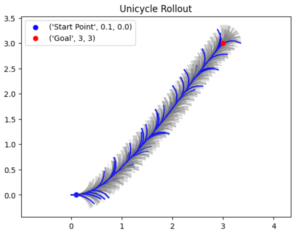 During the semester, we implemented a Model Predictive Path Integral (MPPI) controller to drive a unicycle around a simulated racetrack. Given the computational limitations of the Raspberry Pi 3, I modified the MPPI algorithm (m-MPPI) to reduce computational costs. The original MPPI approach, which continuously samples angles for predicted trajectories, caused delayed control outputs and resulted in crashes. To address this, I adjusted the algorithm to sample random angles only once and fix each trajectory to a specific angle. Similar to MPPI, the nominal trajectory was selected based on weighted sampling, and trajectory costs were calculated based on the Euclidean distance to the goal and LiDAR scan data for occupancy checks.